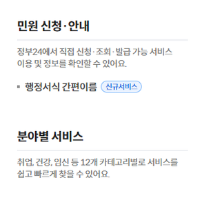 - 원하는 민원을 검색하거나 분야별로 찾아볼 수 있습니다.