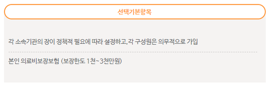공무원 단체보험은 맞춤형 복지포탈의 중요한 부분입니다. 이는 기본항목 중에서도 필수기본항목에 해당되며, 전체 구성원이 의무적으로 가입해야 합니다.