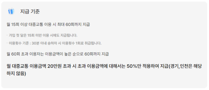 | 적립 요건 | 월 15회 이상 대중교통 이용 시 적립 가능, 최대 60회까지 적용 |