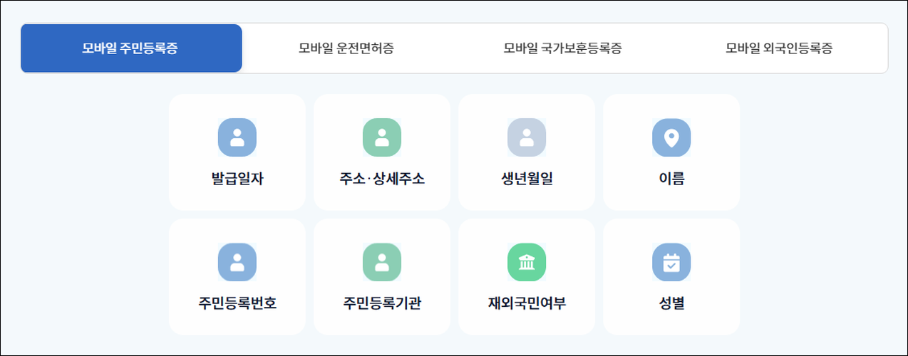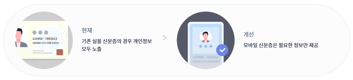 기존 실물 신분증의 경우 신분 확인 시 모든 개인정보가 노출되는 문제가 있었습니다. 하지만 모바일 신분증은 사용자가 제공할 정보를 선택할 수 있기 때문에 불필요한 정보 노출을 방지할 수 있습니다.