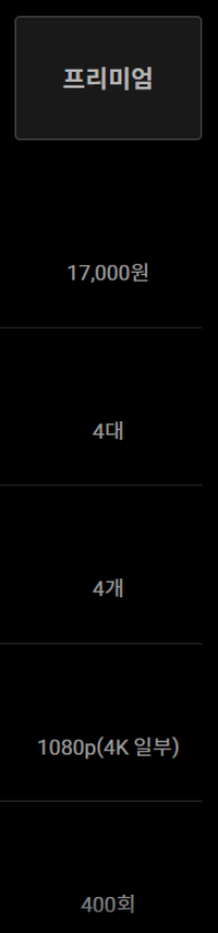 | 프리미엄 | 17,000원 | 4대 | 4개 | 1080p(4K 일부) | 400회 | 최고 화질, 최대 동시 시청 |