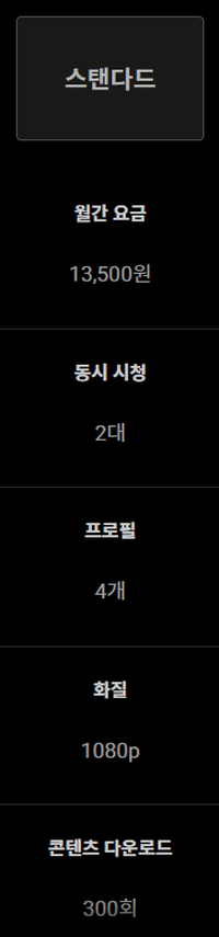 | 스탠다드 | 13,500원 | 2대 | 4개 | 1080p | 300회 | 광고 미포함 |