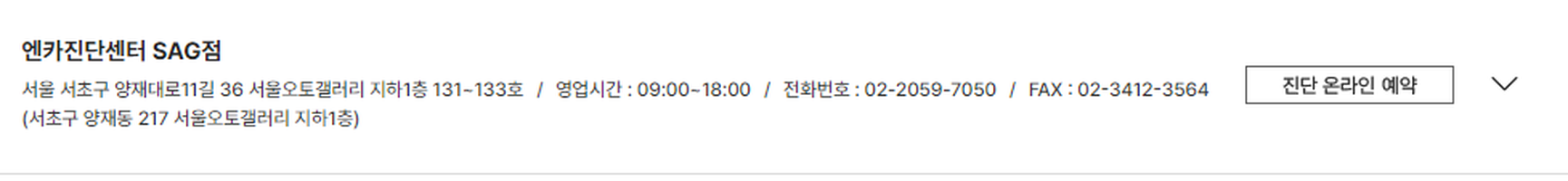 | 서울 | 서초구 양재대로11길 36 서울오토갤러리 지하1층 131~133호 | 02-2059-7050 | 09:00~18:00 |